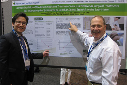 허리디스크 수술을 3년 이내에 받은 척추 수술 실패 증후군 환자를 대상으로 통증이 70% 이상 감소하는데 걸리는 치료기간을 비교 분석하였습니다. 이때 수술 치료를 받지 않고 재발한 환자의 경우 2주, 척추 수술실패증후군 환자는 평균 3주로 수술치료를 받지 않았던 환자가 수술치료를 받은 환자보다 30% 이상 빠르게 치료된다는 연구결과를 확인하였습니다. 해당 연구결과는 2013년 6월 세계재활의학회(ISPRMM)에 공식 발표하였습니다.