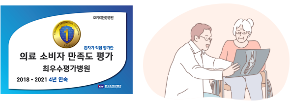 우수한 의료진이 수준 높고 친절한 의료서비스로 진료하고 있어서 ‘4년 연속’ KCA 한국소비자만족도평가 최우수병원으로 선정됐습니다.